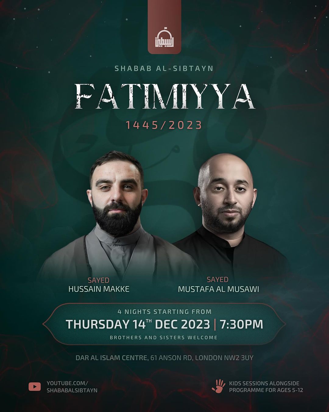 Shabab Al-Sibtayn are honoured to invite you to their Fatimiyya majlis, commemorating the martyrdom of Lady Fatima al-Zahra’, for the year 1445/2023